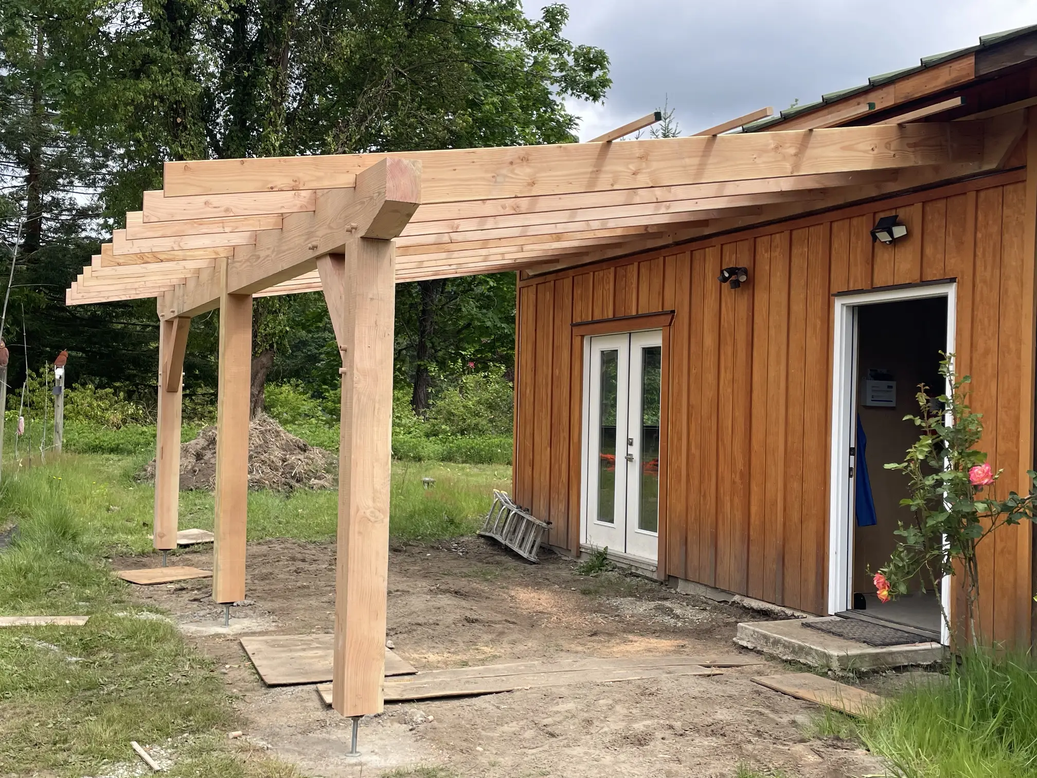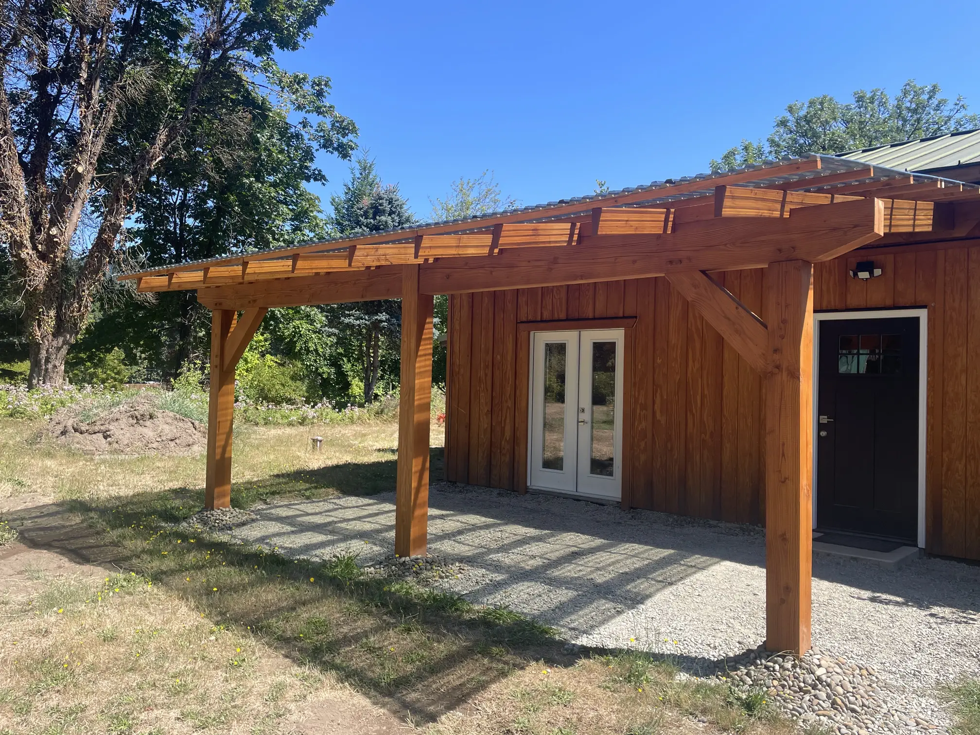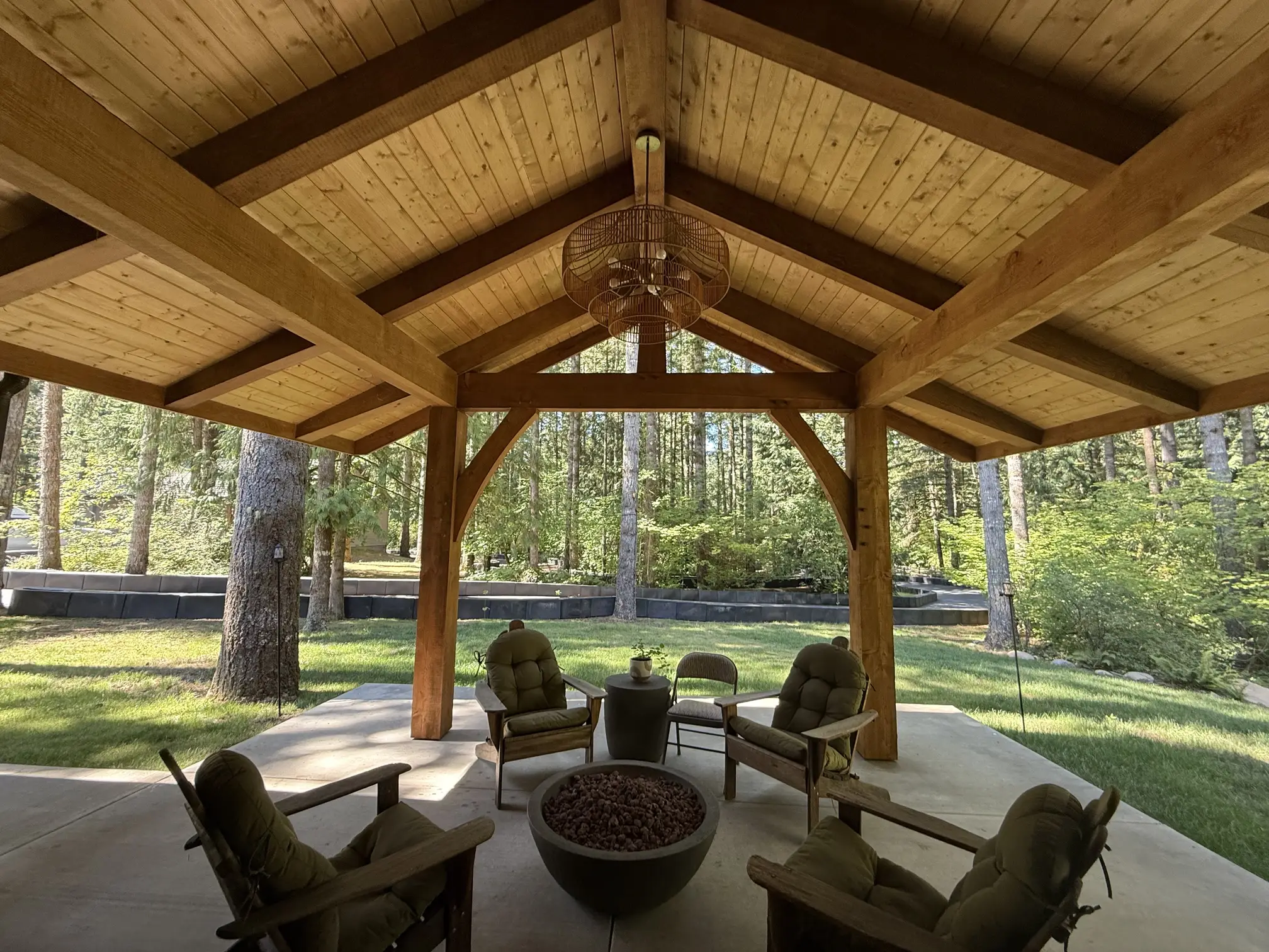 Timber framing is our main specialty. It's a traditional method of construction using heavy wooden beams joined together — known for its strength, beauty, and longevity. Timber frames are ideal for covered patios, pergolas, barns, garages, and custom home additions.